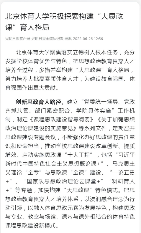 新华社、人民日报、中国青年报、光明日报、教育部官网、中国教育电视台等权威媒体和重要报刊累计报道体育大思政成果经验百余次,其中,中央主流媒体报道占比近半。