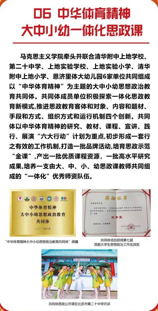 联合北京市第二十中学、清华附中上地、上地实验小学、海淀区恩济里体大幼儿园等7家单位,成立了以“中华体育精神”为主题的大中小幼思想政治教育共同体。共同体以中华体育精神的研究、教材、课程、宣讲、践行、展演“六大行动”计划为重点,形成了一套有效的工作机制。