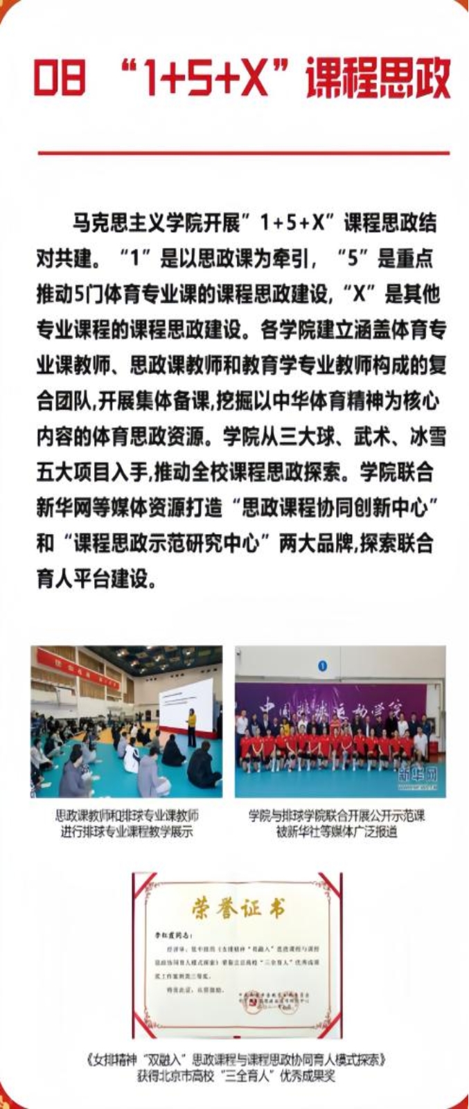 在办好思政课程的同时,推进“1+5+X”课程思政结对共建。“1+5+X”模式中,“1”是以思政课为牵引,“5”是重点推动排球、篮球、足球、武术、冰雪5门体育专业课的课程思政建设,“X”是带动其他专业课程的课程思政建设。通过组建“体育专业课教师+思政课教师+教育学教师”复合团队,开展联合集体备课。