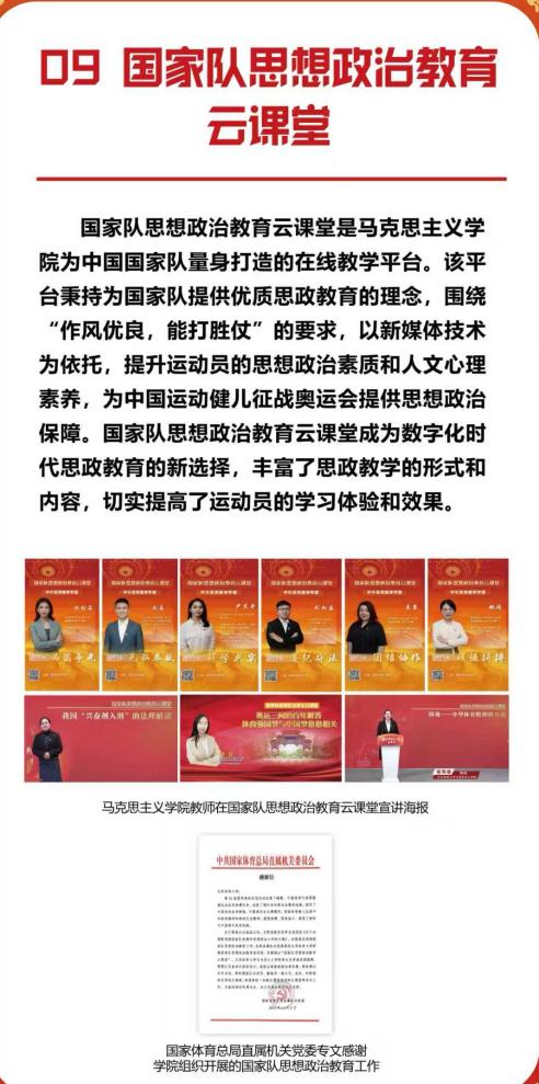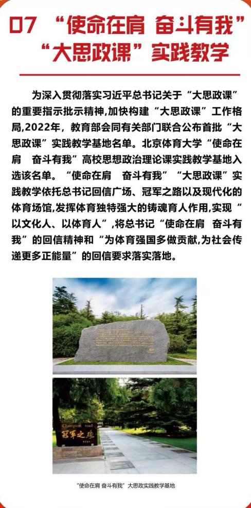 学校充分发挥体育独特的育人功能,将思政课堂拓展到训练场、比赛场、网络平台、校史馆、体育博物馆及志愿服务一线等社会实践大课堂中。相继开辟奥运冠军讲思政课、体育局长(司长)讲思政课、体育场馆思政课、革命传统教育、形势与政策课、中华体育精神大中小幼一体化思政课、“使命在肩 奋斗有我”大思政课实践教学、“1+5+X”体育课程思政、国家队思想政治教育云课堂、AI赋能思政课改革创新等特色项目,传承和弘扬中华体育精神,充分挖掘和转化体育资源中的思想政治教育价值,切实提升学生的政治素养与体育核心素养。