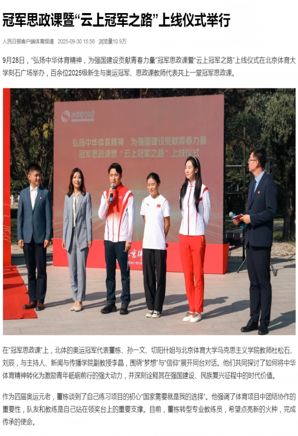3.《体育大思政讲堂》系列栏目:以冠军专题宣讲为核心,邀请奥运冠军结合重大主题分享经历、答疑解惑,同时整合前期“冠军大讲堂”“奥运冠军励志讲座”等品牌资源,形成连贯的冠军思政宣讲体系。