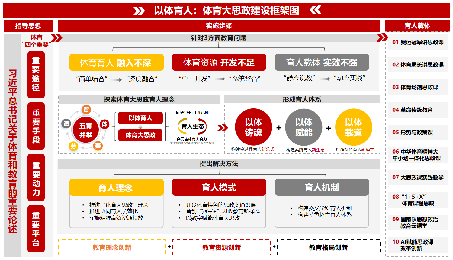 针对体育思政资源挖掘不充分、整合统筹能力弱的问题,通过构建特色育人模式,系统开发冠军精神、体育文化等特色资源,建立协同机制,实现从“单一开发”到“系统整合”的提升,增强体育育人的资源转化效能。