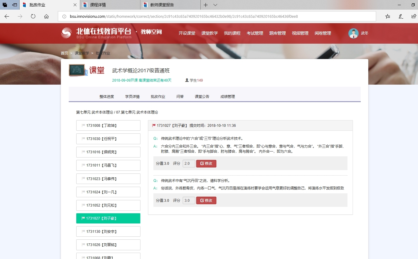 其次,教师工作量的计算。原本32学时的《中国武术导论》课程,因为,增加在线的大量答疑与批改作业,反而占去很多课余时间。例如,150人课程,7个单元,每个单元至少2道主观题的批改,其工作量之大不言而喻。这个问题值得思考与切实解决。