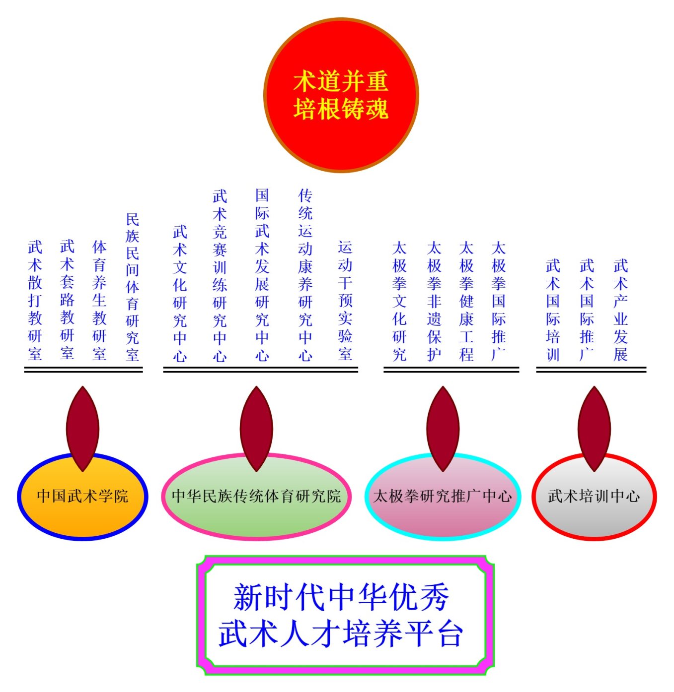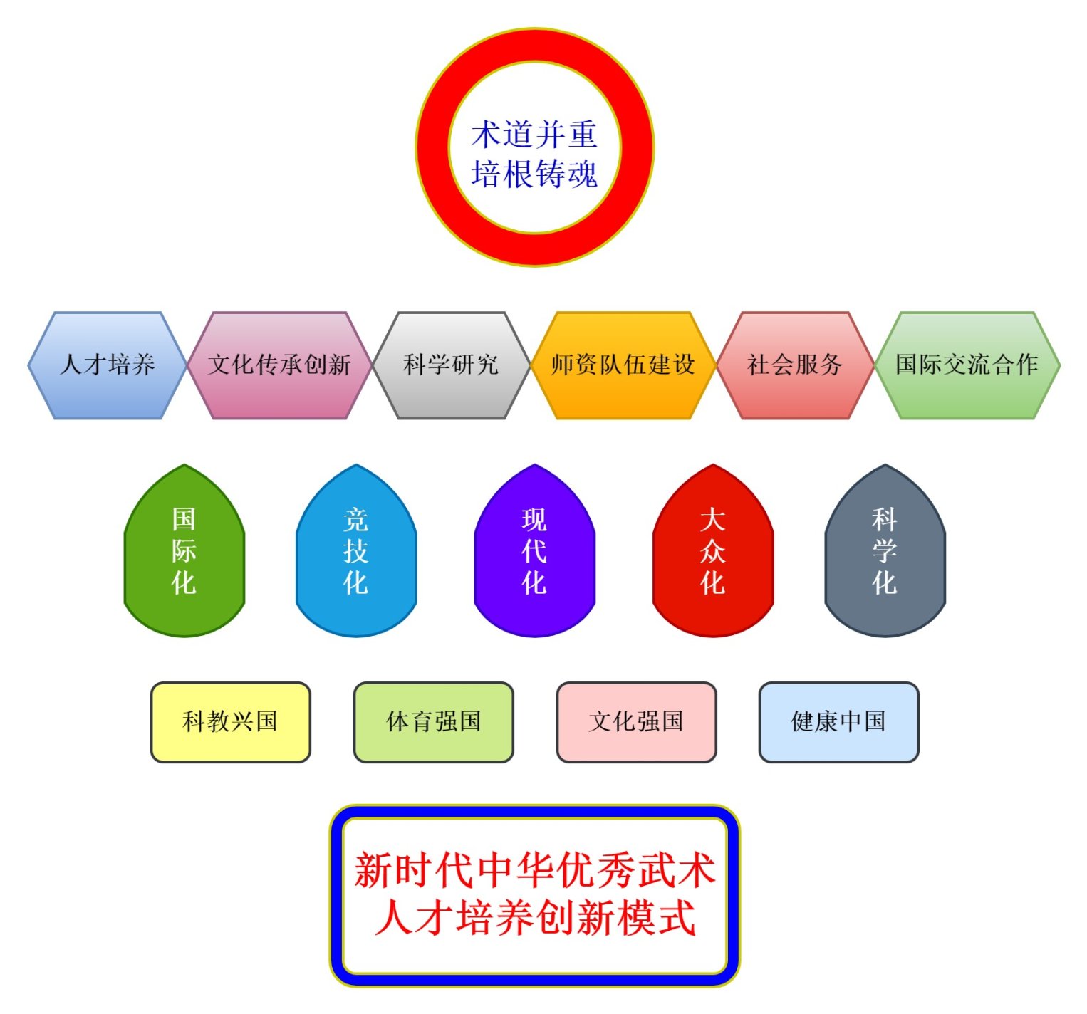 以“术道并重 培根铸魂”新时代中华优秀武术人才培养为目标,以“国际化、竞技化、现代化、大众化、科学化”为路径,恪守正道,开拓创新,推进世界一流民族传统体育学学科建设,创新中华优秀武术人才培养模式。
