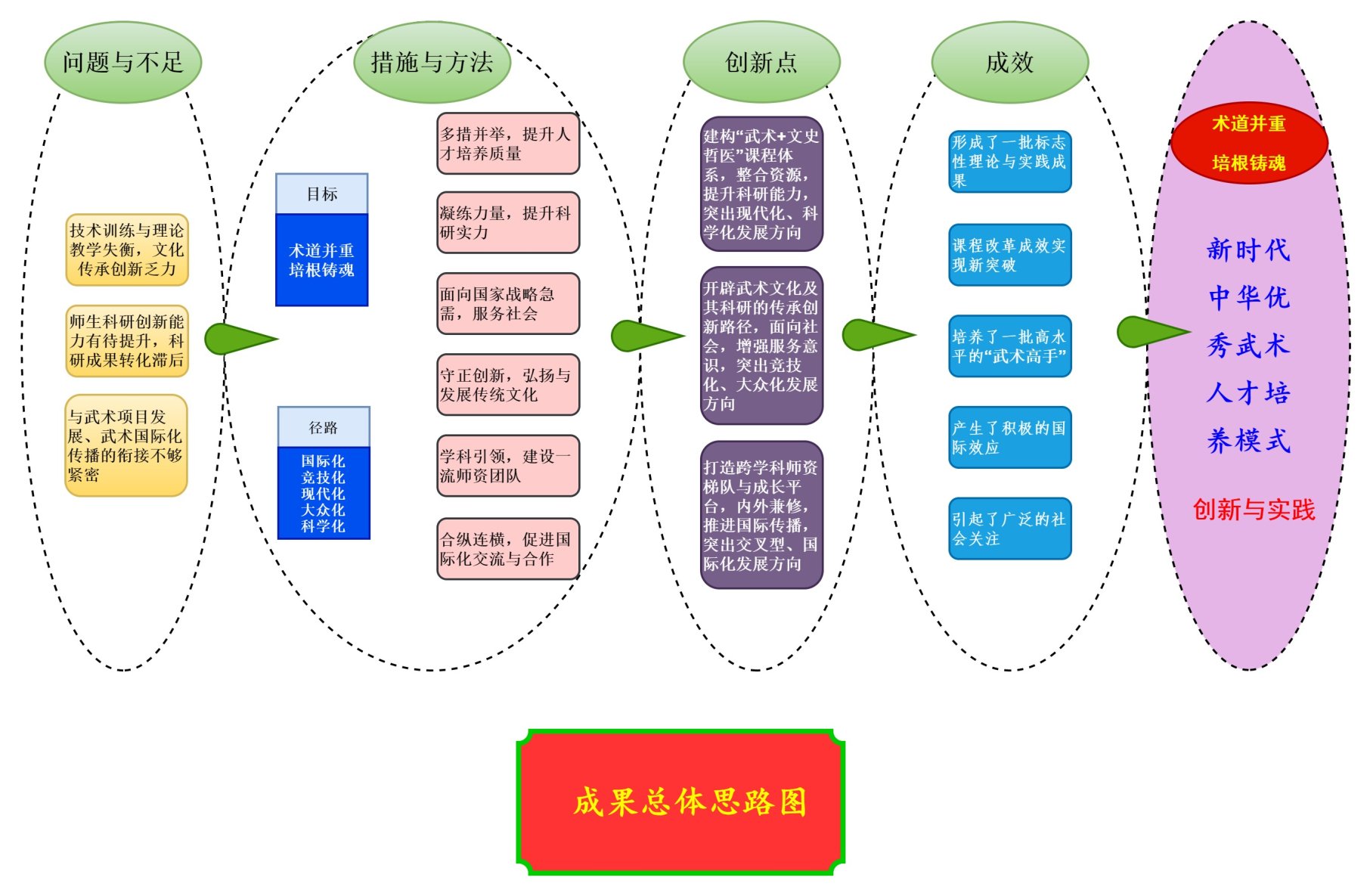长期以来,武术人才培养存在现代化不足、国际化不深、竞技化不齐、大众化不普、科学化不精等问题,特别是单纯强调训练与技术,锦标主义突出,忽略理论教学、文化素质、道德情操、家国情怀的养成,严重影响学科发展与专业人才培养,难以满足新时代高质量人才的社会需求。自2017年以来,北京体育大学中国武术学院提出“术道并重 培根铸魂”发展目标,聚焦国家急需,立足新时代发展,标的立德树人,强调文化与武艺双臻、技术与道义共融的人才培养创新理念,突出传统经验型与现代科学精神相融合的师资队伍建设与教学、训练、科研方向,加强武术竞技标准化与大众武术普及化,取得高质量人才培养、科研成果转化与服务社会的良好效果,面向体育强国、科教兴国、健康中国战略,推动武术文化的国际交流与传播,推进武术“走出去”战略,助益人类卫生健康共同体倡议,致力于世界一流民族传统体育学学科建设和新时代高质量综合型中华优秀武术人才培养,从课程设置、教学教务、科研创新、社会服务、国际化发展等方面切入,实现创造性转化、创新性发展,经过近五年的推广,取得丰硕成果。