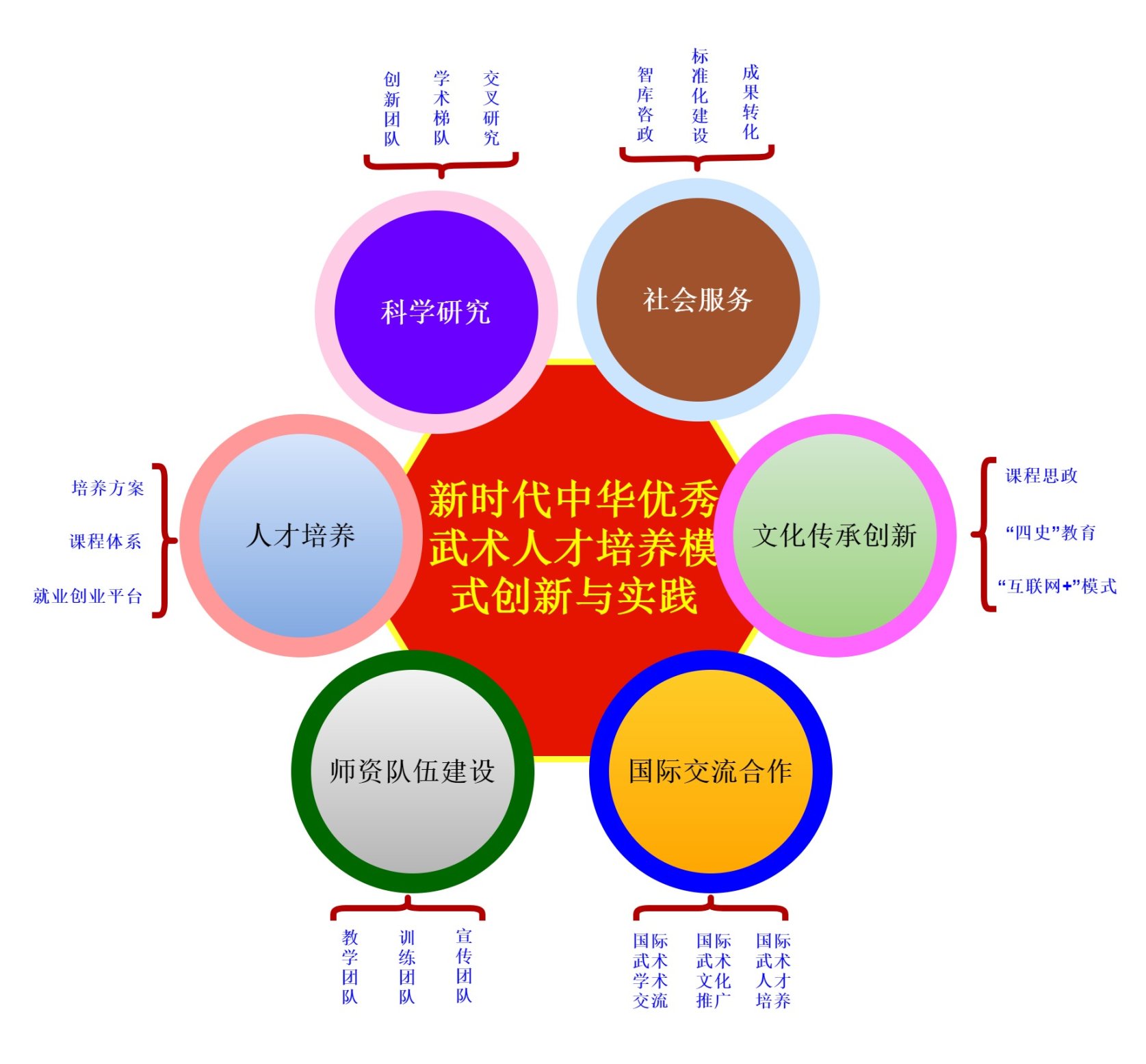 (一)聚焦现代化、科学化发展方向,建构“术道并重”课程体系,整合资源,提升师生科研能力。在武术专项训练课程基础上,增加文史哲医课程,打造高端线上课程,建立一流实践教学平台,培育学生创新创业能力;以“武术+互联网”为载体,创新教学模式,推出《缠丝健身功法》《24式太极拳》《综合格斗》等慕课课程;建立传统运动康养研究中心、传统养生功法运动干预实验室,加强体医融合和非医疗健康干预的研究与实践;服务健康中国战略,建立高水平教科研基地,促进体医融合研究;注重学生社会实践与实习创业平台建设。