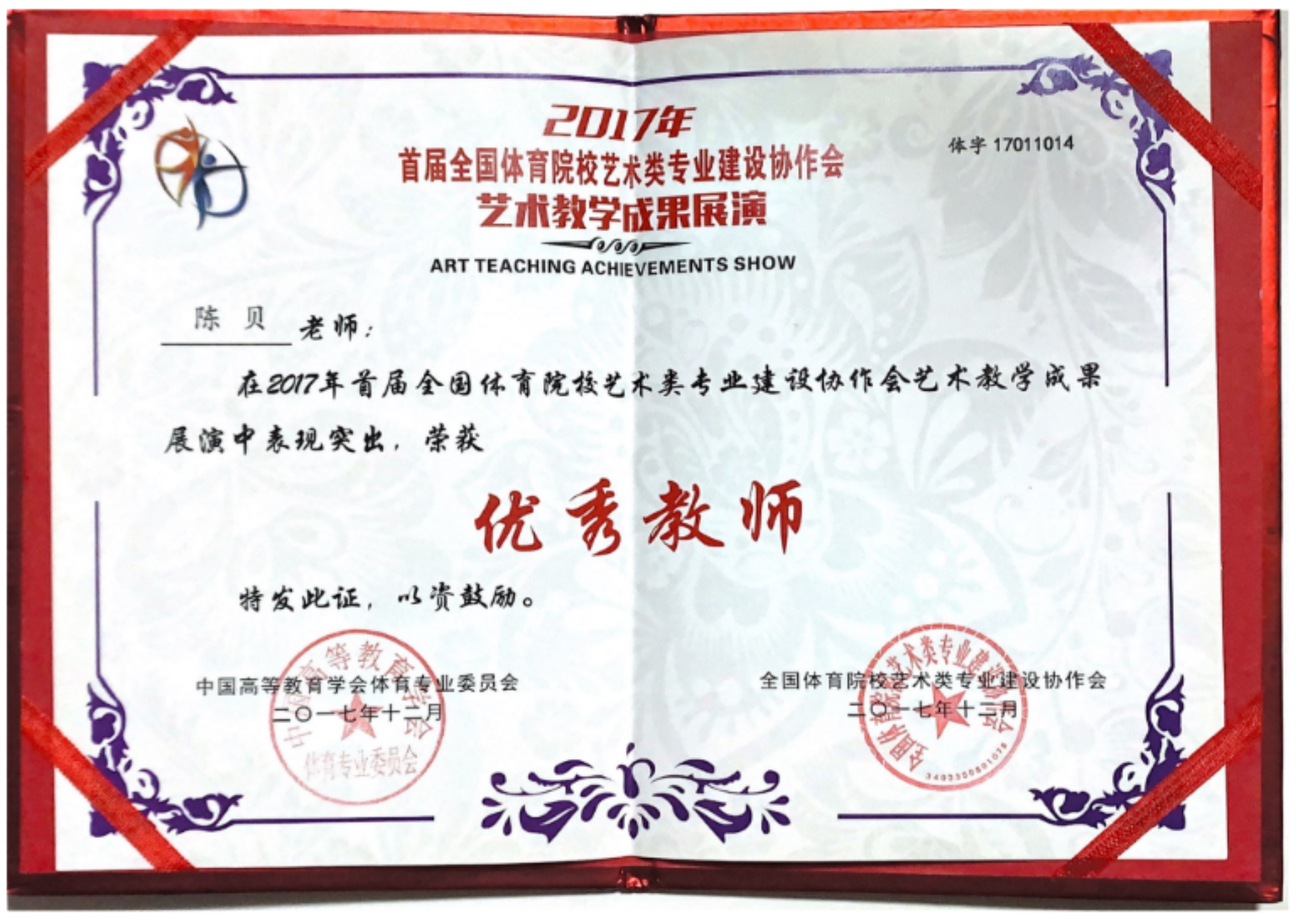 3、首届全国体育院校艺术类专业建设协作会艺术教学成果展演优秀教师奖(2017年)