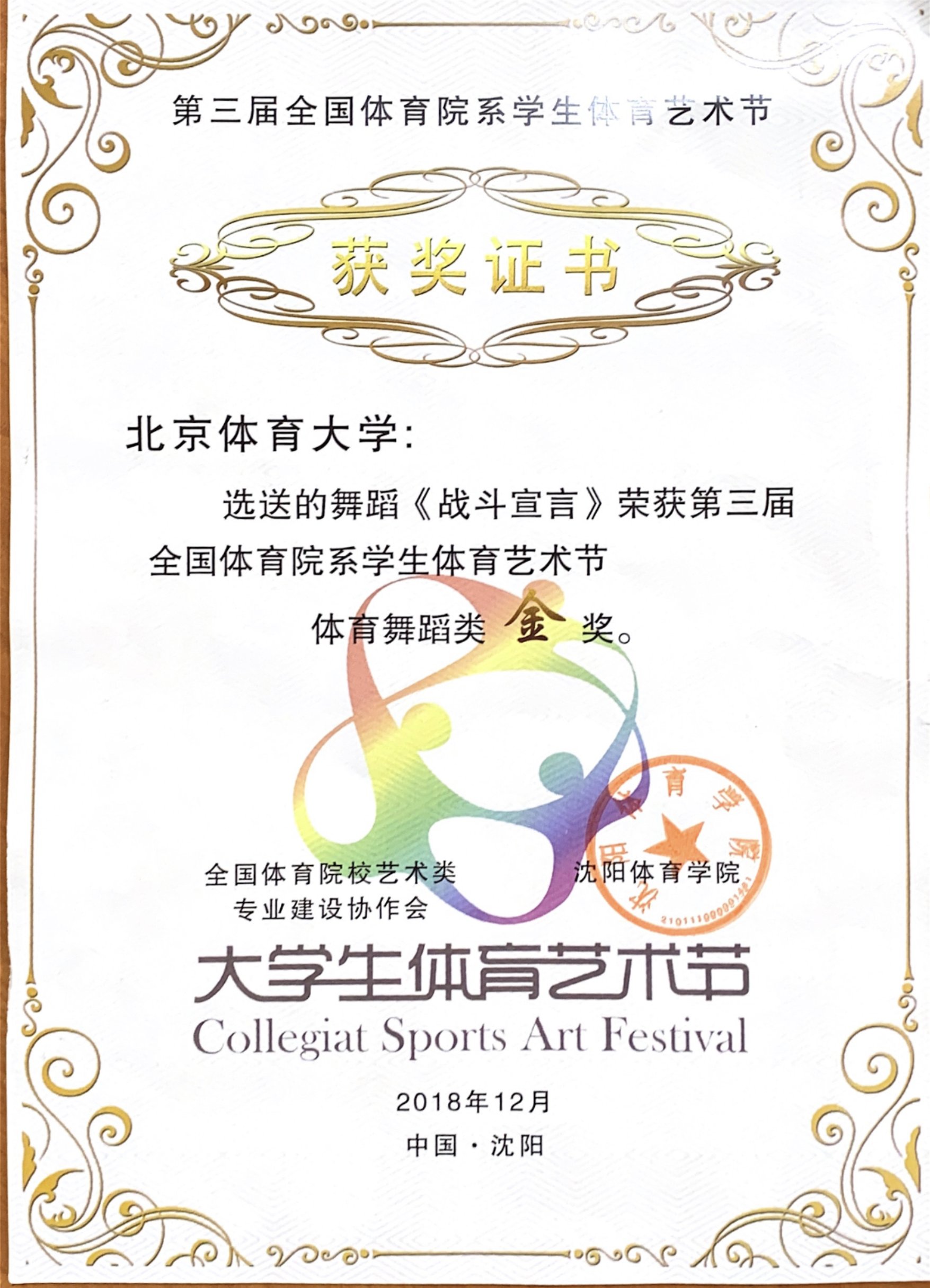 (5)第三届全国体育院系学生体育艺术节体育舞蹈类金奖、作品《战斗宣言》获奖证明